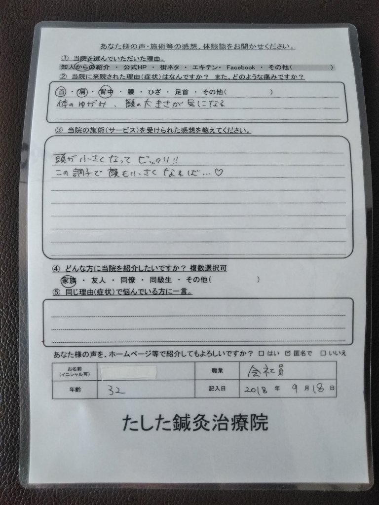 当院の小顔調整、頭蓋骨調整を受けた感想
