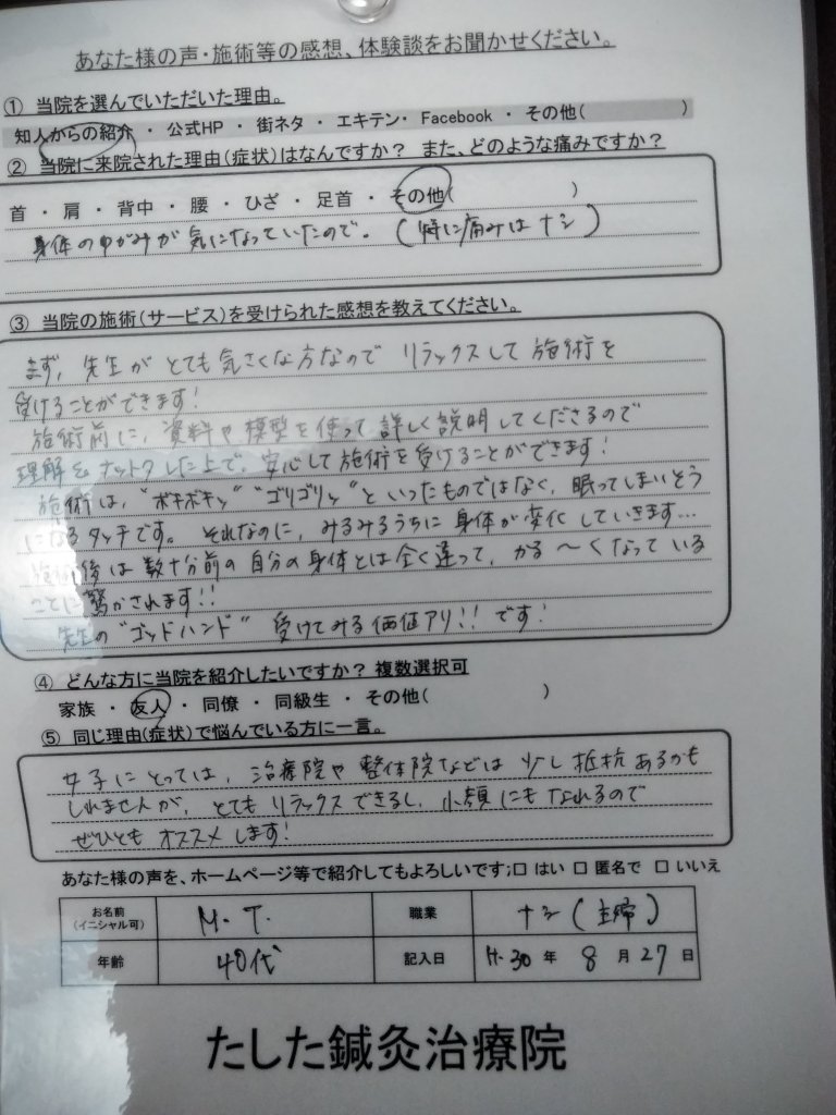 【当院の施術(サービス)を受けられた感想を教えてください】