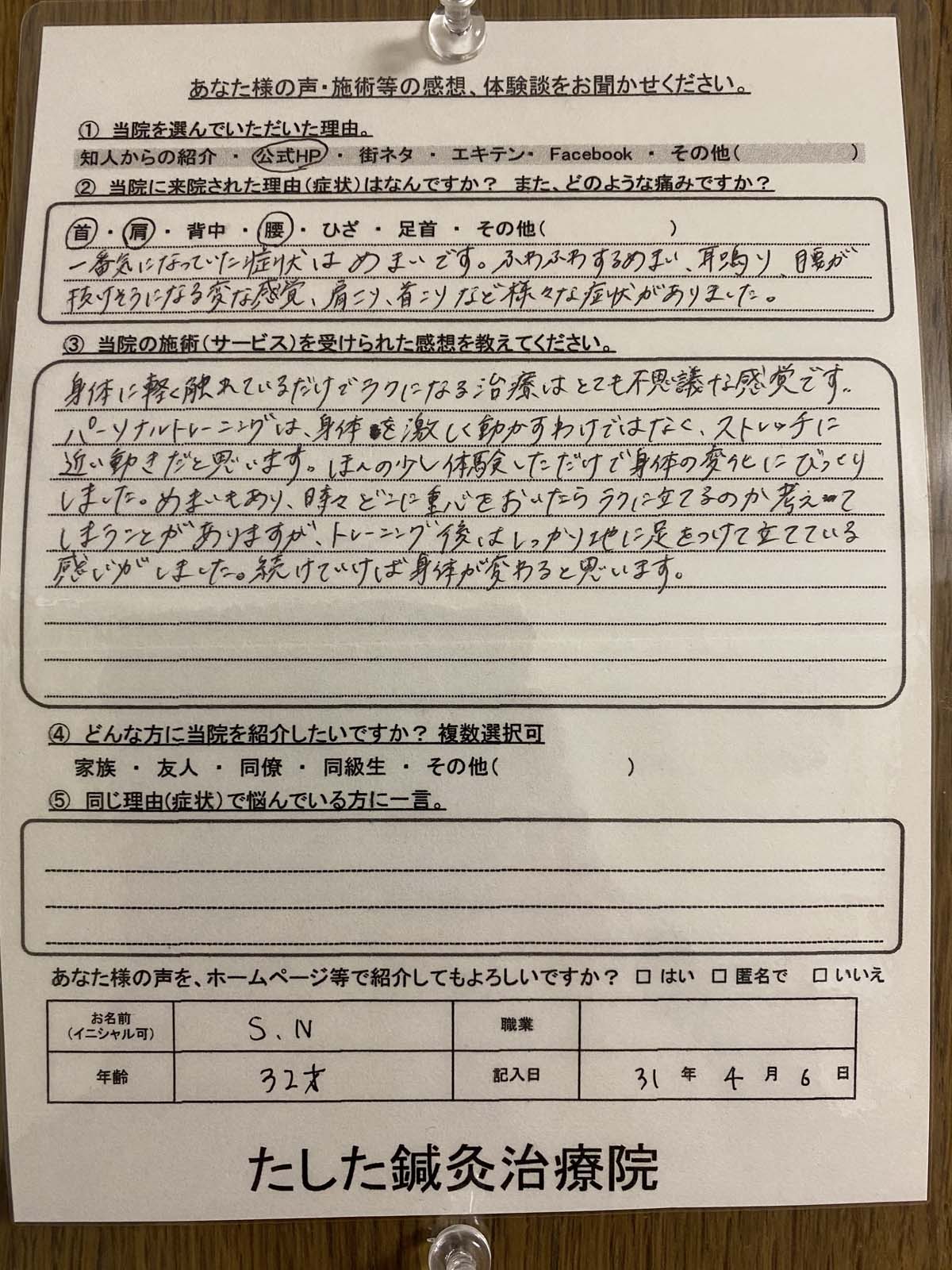 S.Nさん(32才 女性 目まい耳なり他 記入日2019年4月6日)