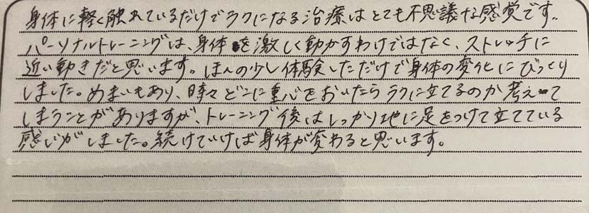 目まい、耳なり、肩こり、首こりでお悩みの方からいただいた、施術とパーソナルトレーニングの感想です。