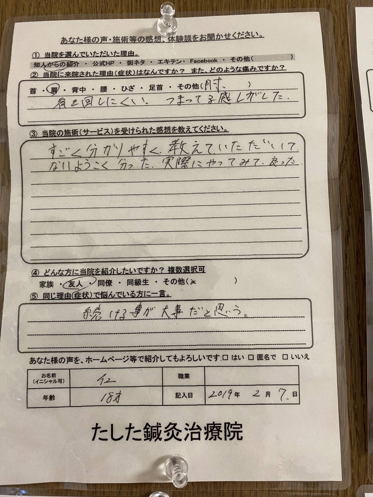 仁さん(18歳 男性 肩・肘の不調 記入日2019年2月7日)
