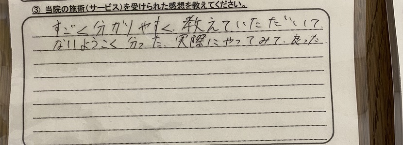 肩と肘の不調でお悩みの方からいただいた、施術の感想です。