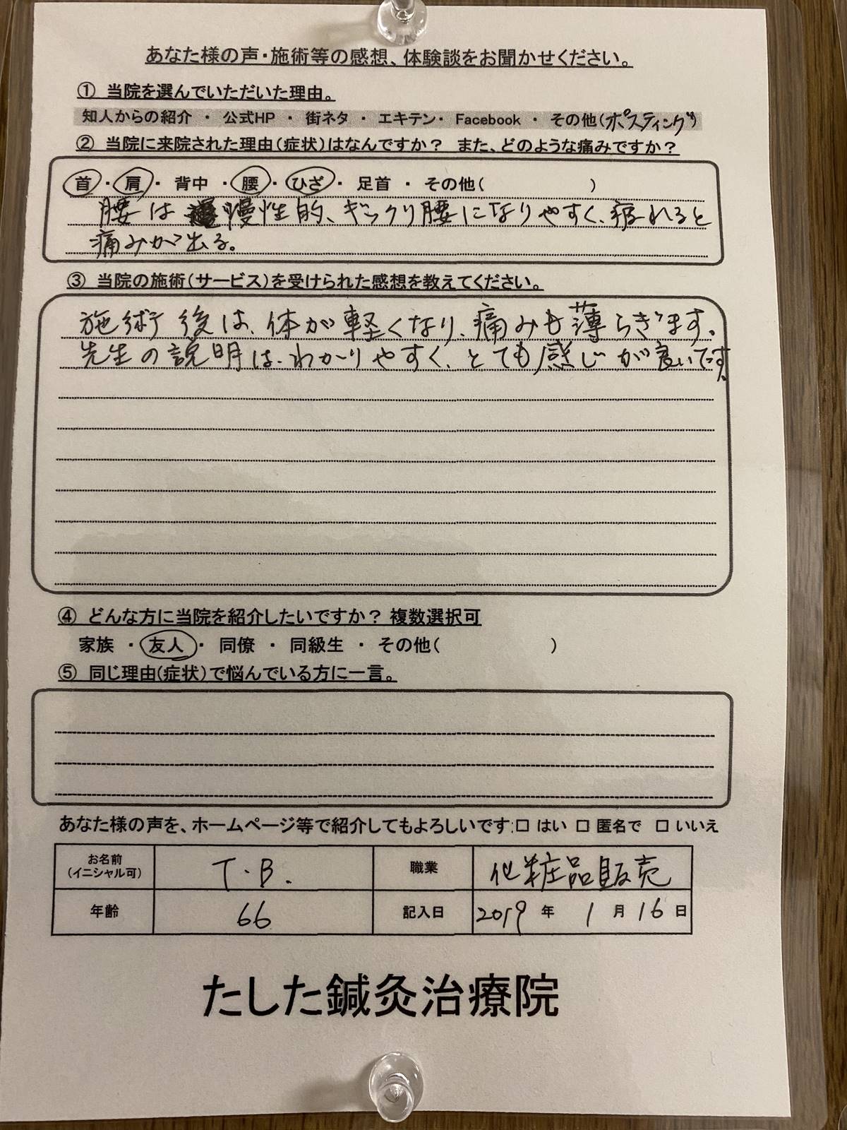 T.B.さん(66歳 女性 化粧品販売 腰痛 記入日2019年1月16日)
