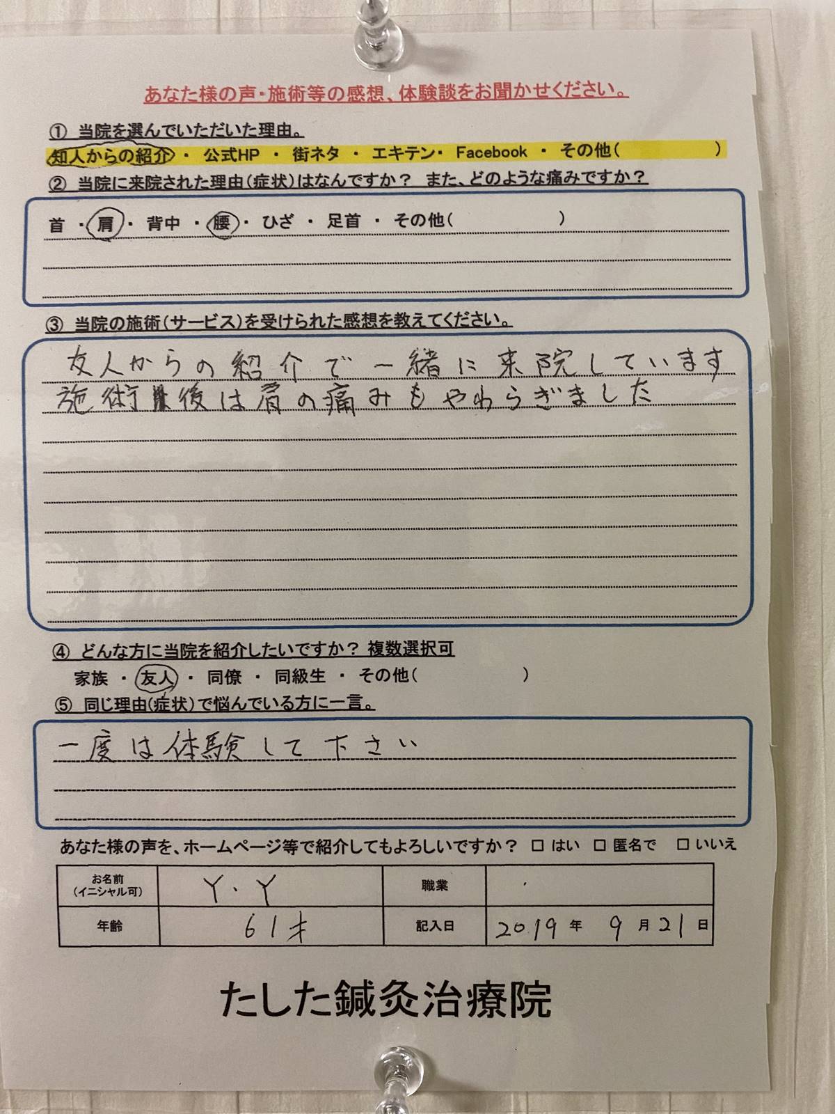 Y.Y.さん(61歳 女性 肩と腰の痛み 記入日2019年9月21日)