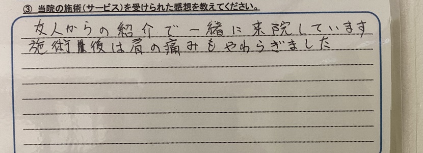 友人からの紹介で一緒に来院しています。施術後は肩の痛みもやわらぎました。