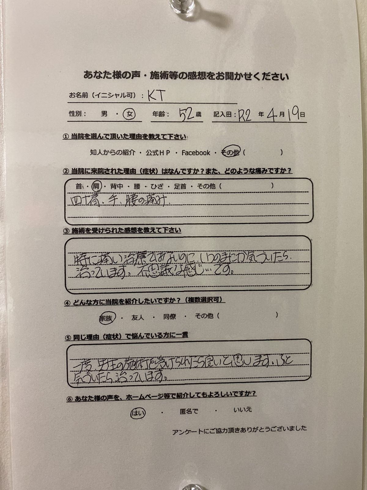 KTさん(52歳 女性 四十肩、手と腰の痛み 記入日2020月4月19日)
