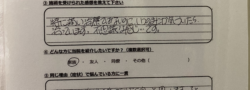四十肩、手と腰の痛みでお悩みの方からいただいた、施術の感想です。