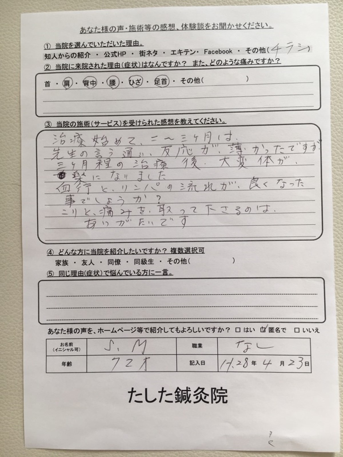 S.Mさん(72歳 男性 肩や背中、腰、ひざ、足首のコリと痛み 記入日2016月4月23日)