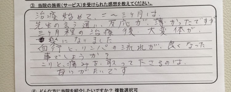肩や背中、腰、ひざ、足首のコリと痛みでお悩みの方からいただいた、施術の感想です。