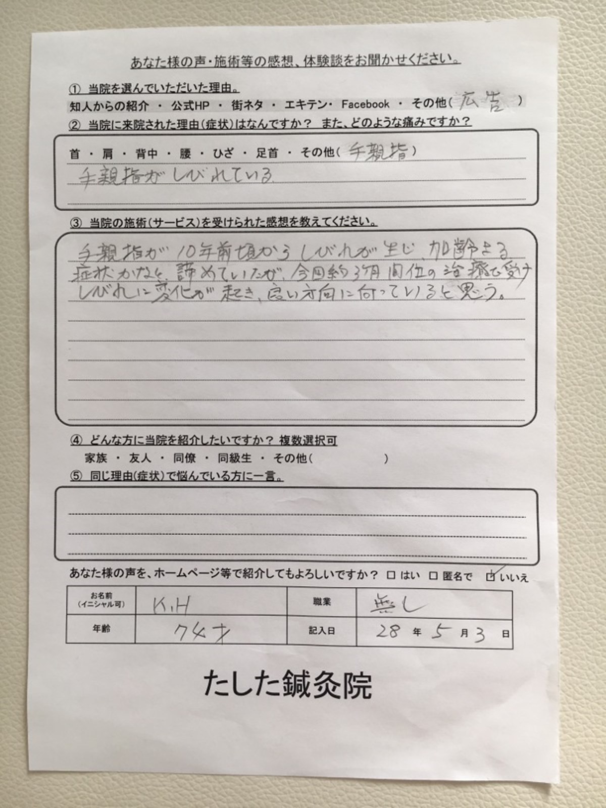 K.Hさん(74歳 女性 手の親指のしびれ 記入日2016月5月3日)