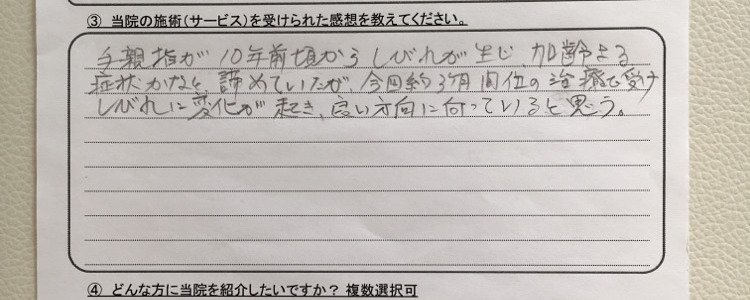 手親指に10年前頃からしびれが生じ、加齢による症状かなと諦めていたが、今回約3ヶ月間くらいの治療を受けしびれに変化が起き、良い方向に向かっていると思う。