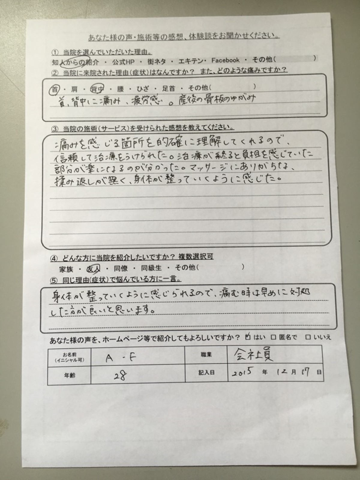 A.Fさん(28歳 女性 会社員 首と背中の痛み、疲労感、骨盤のゆがみ 記入日2015月12月17日)