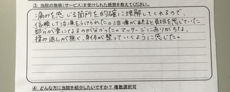 痛みを感じる箇所を的確に理解してくれるので、信頼して治療をうけられた。治療が終ると負担を感じていた部分が楽になるのが分かった。マッサージにありがちな、揉み返しが無く、身体が整っていくように感じた。